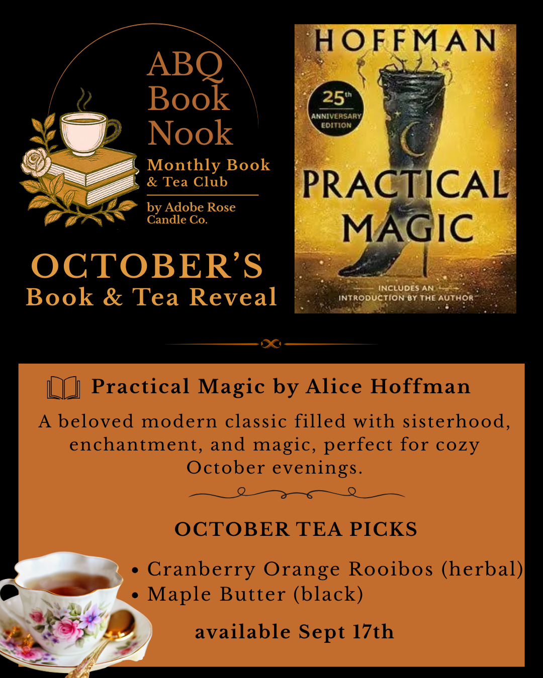 This October, we’re diving into the spellbinding pages of Practical Magic while savoring our teas of the month: Cranberry Orange Rooibos and Maple Butter Black Tea. A perfect pairing for crisp autumn nights.